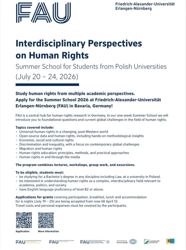 Summer School for Students from Polish Universities: Interdisciplinary Perspectives on Human Rights (July 20-24, 2026) taking place at Friedrich-Alexander-Universität Erlangen-Nürnberg (FAU) and the University of Bayreuth.